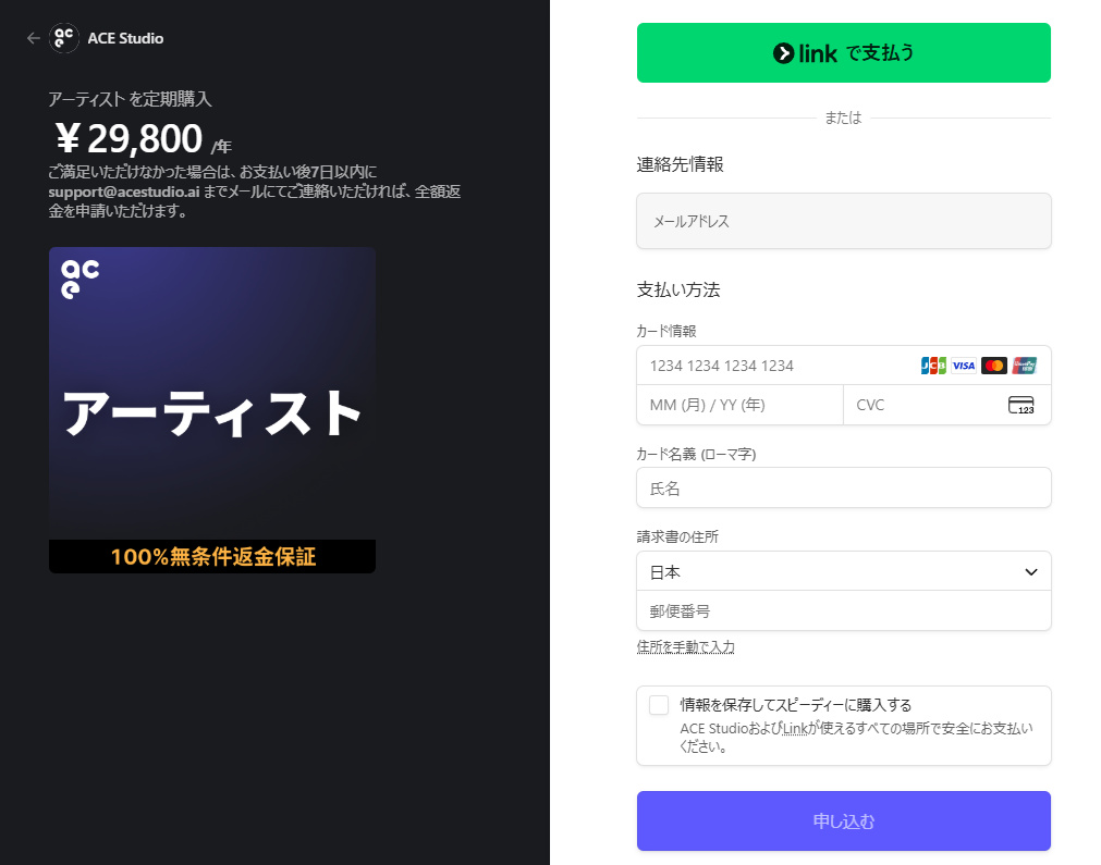 短期間の試用を検討されている方も、まずは「年払い」または「買い切り」での決済が必要となりますが、支払い後7日以内であれば、サポート(support@acestudio.ai)へのメールで全額返金が可能です。