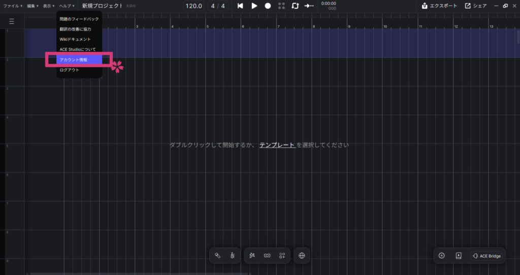 - ACE Studioを起動し、「ヘルプ」→「アカウント情報」の順にクリックします。