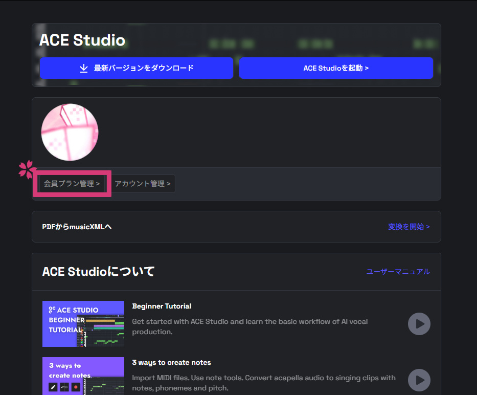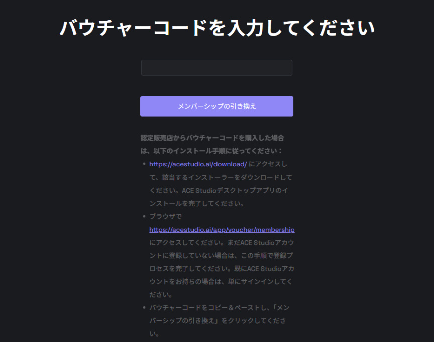 ※ギフトコードの適用には、ACE Studioのアカウントが必要です。導入編を参考に、事前にログインを完了させてから、以下の手順に進んでください。