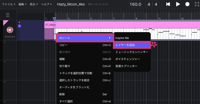 - 選択したリージョンの上を右クリックし、[AIツール]>[レイヤーを追加]の順にクリックします。