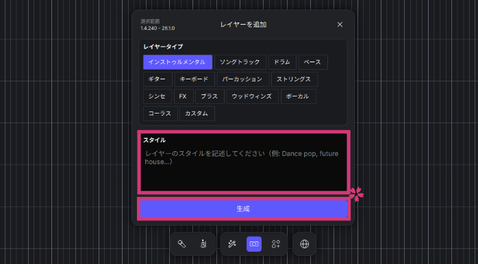 ※今回はデフォルトの「インストゥルメンタル」を選択していますが、生成したい楽器を指定することも可能です。