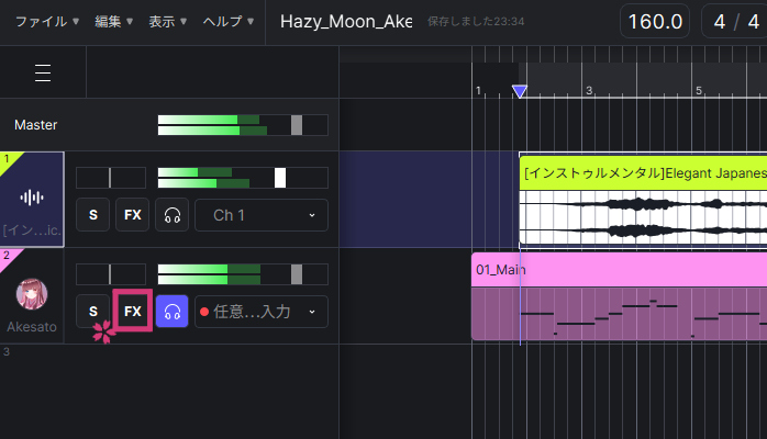 - ウェットなオケに対してボーカルがややドライに感じるので、ボーカルトラックの「FX」をクリックします。
