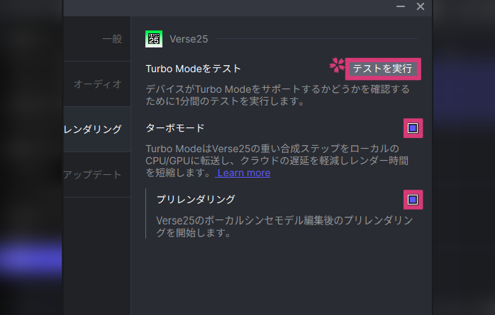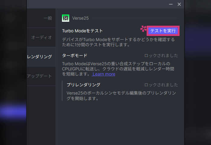 通常、ACE Studioの高品質な歌声合成はクラウド上のサーバーで行われますが、Turboモードを有効にすると、ユーザーが使用しているPCのハードウェアを使って、ローカルで音声を生成するようになります。