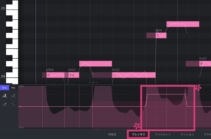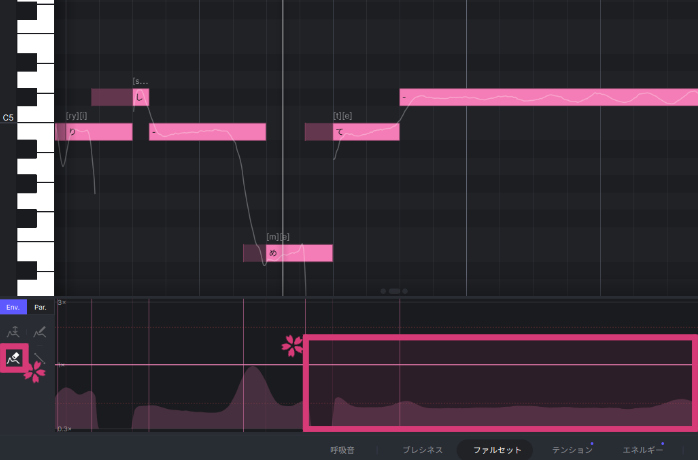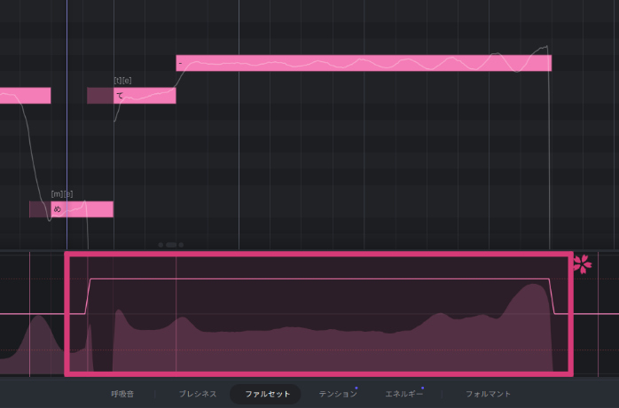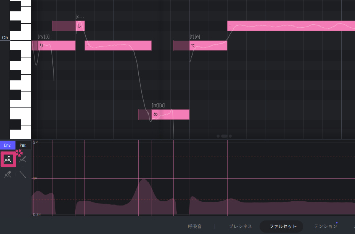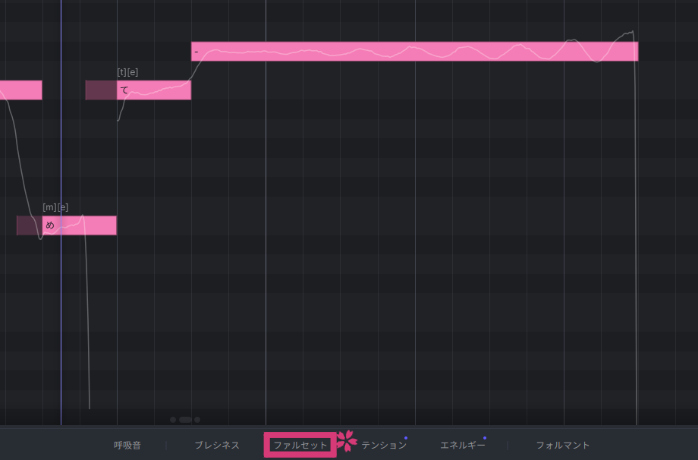 「ファルセット」タブで綺麗な裏声にならなかった場合は、「ブレシネス」タブで同様のエンベロープを描くと上手くいく場合があります。