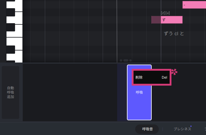 - 呼吸音を削除したい場合は、「呼吸」が選択された状態で[Delete]キーまたはで[右クリック]>[削除 Del]で削除できます。